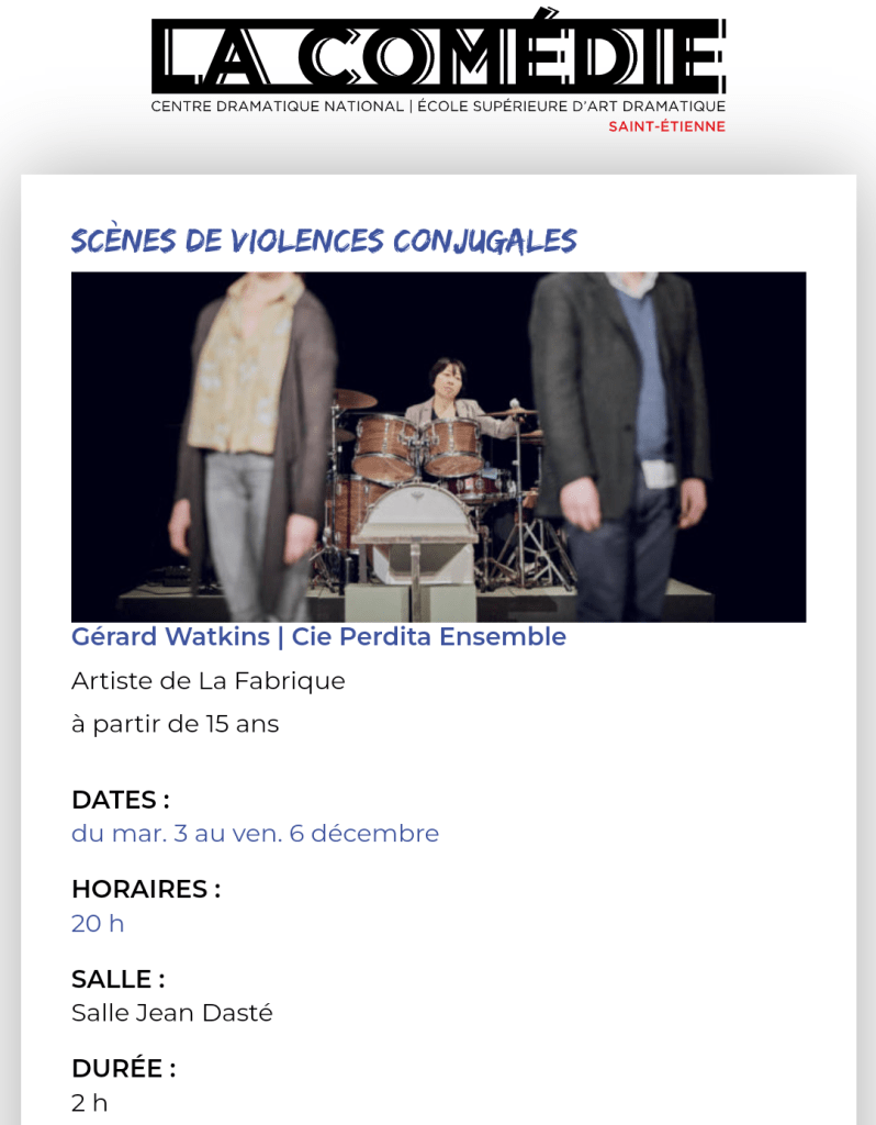 Le samedi 7 décembre à 11h, à la Comédie, Des Mots Pour Panser animera une discussion en présence du metteur en scène Gérard Watkins et de professionnel.le.s du soin qui accompagnent des personnes victimes de violences conjugales.